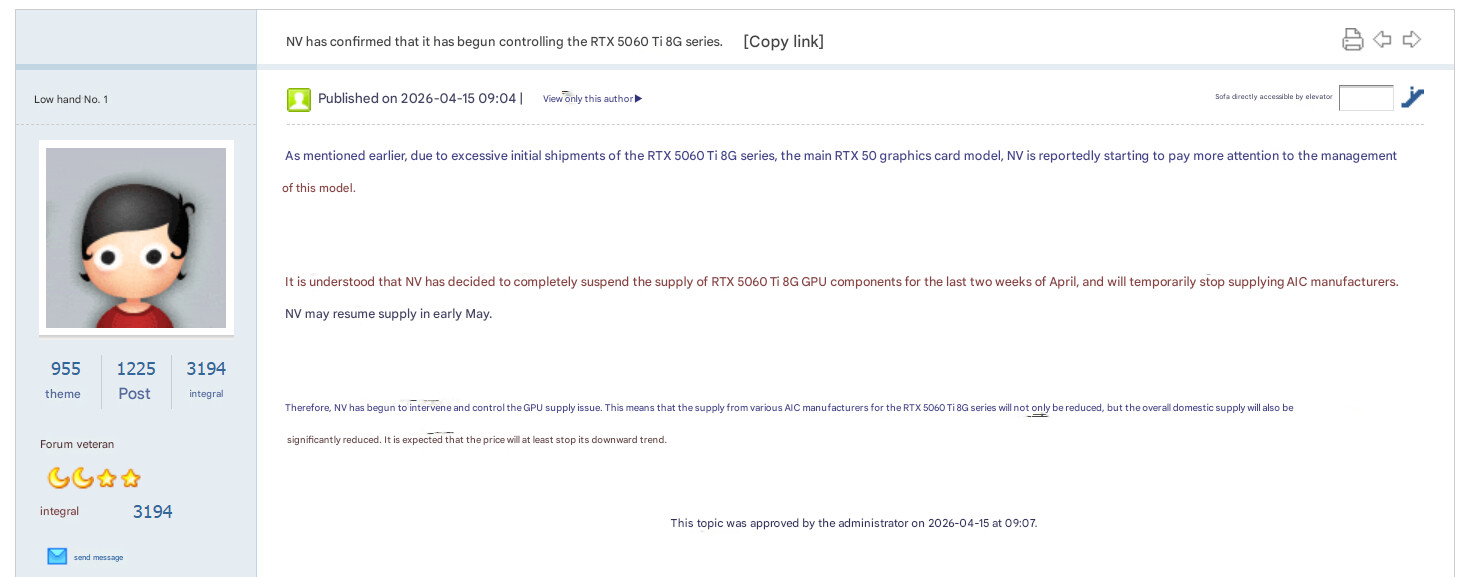Kabar mengejutkan datang dari forum Board Channels. NVIDIA dilaporkan bakal mengerem produksi GPU GeForce RTX 5060 Ti varian 8 GB selama dua minggu penuh di penghujung April ini. Langkah ini diambil bukan karena kekurangan bahan baku, tapi justru karena masalah sebaliknya: kelebihan stok (oversupply).